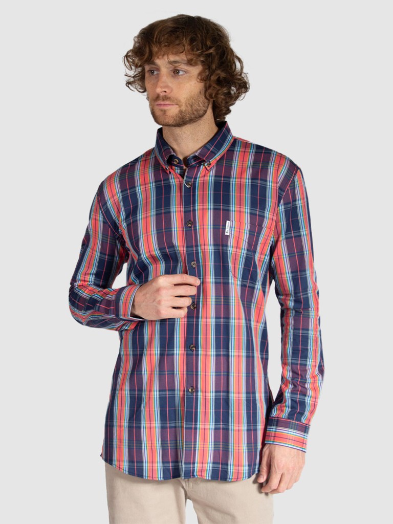 Esta camisa de manga larga con cuadros de tartán irregulares presenta un dobladillo curvado y un cuello con botones de tres dedos. Confeccionada en 100 % algodón esta camisa de corte clásico se completa con una etiqueta de la marca en el pecho.