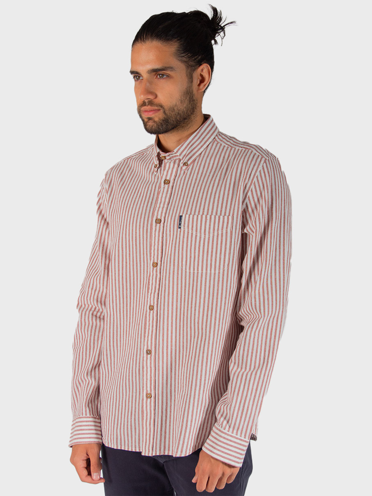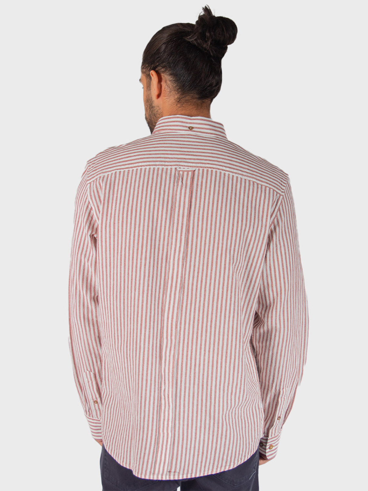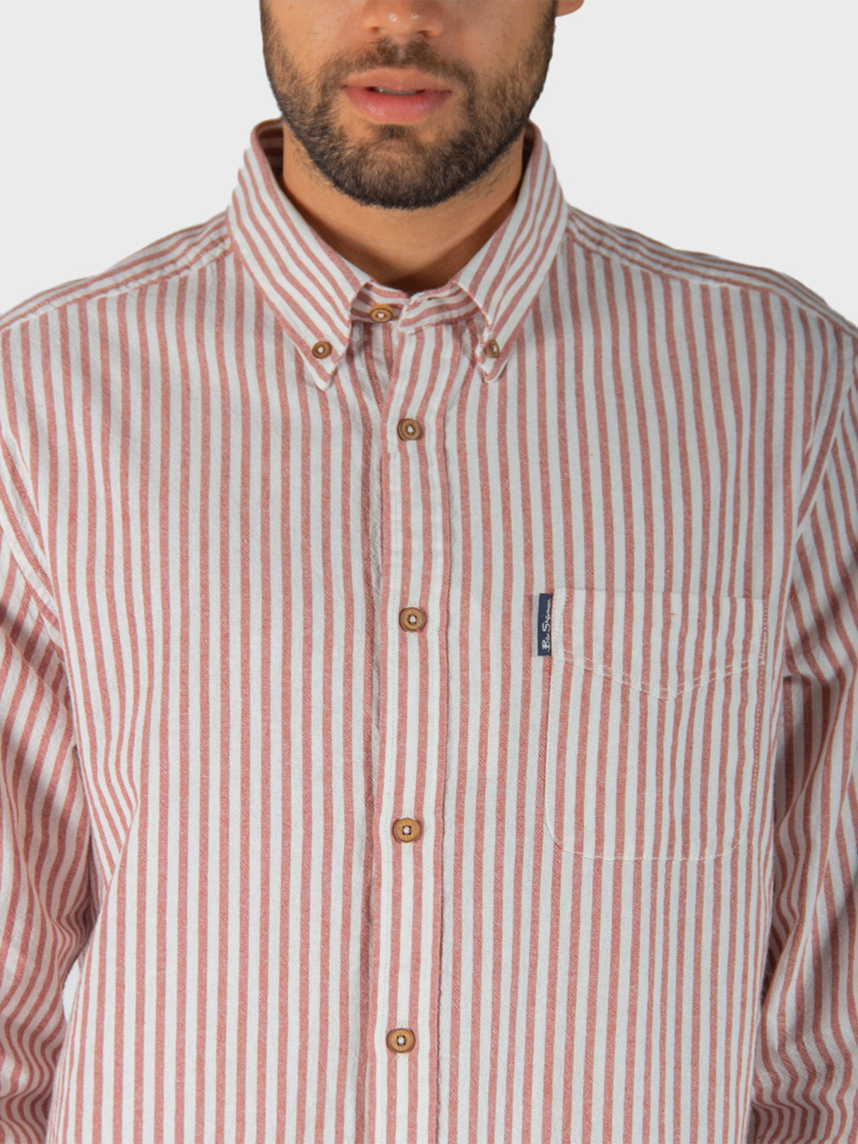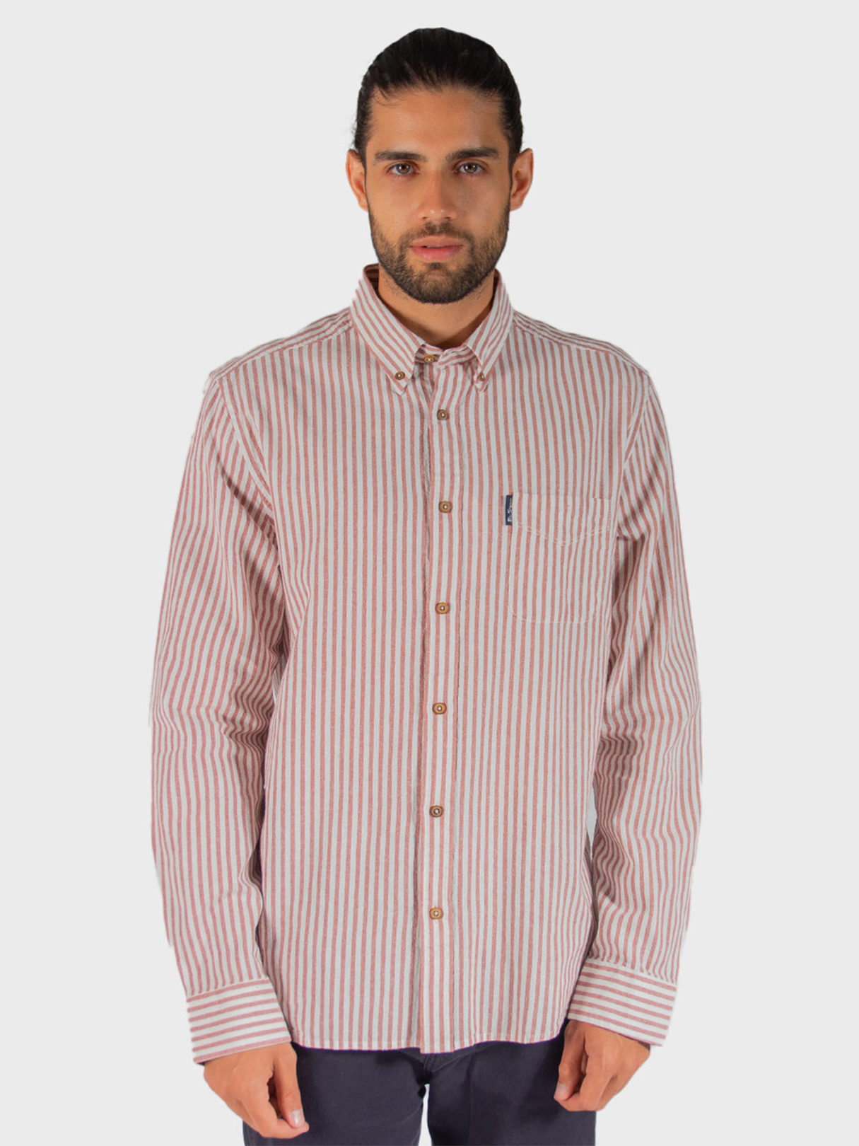 Nuestra camisa de rayas oxford de algodón tiene un corte recto manga larga y cuello abotonado con dos dedos.
