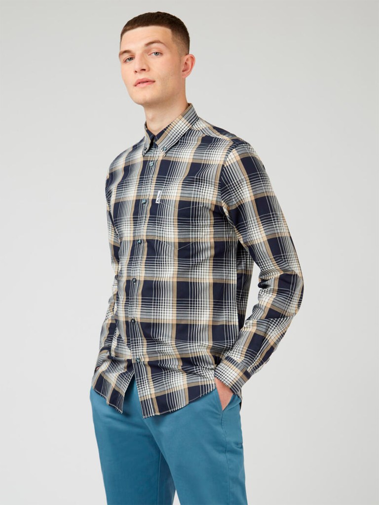 Esta camisa de corte regular está diseñada con un tejido de cuadros lineales. Con dobladillo curvado cuello con botones de dos dedos y una etiqueta tejida con la marca Ben Sherman en el bolsillo del pecho. Confeccionado en 100% algodón.