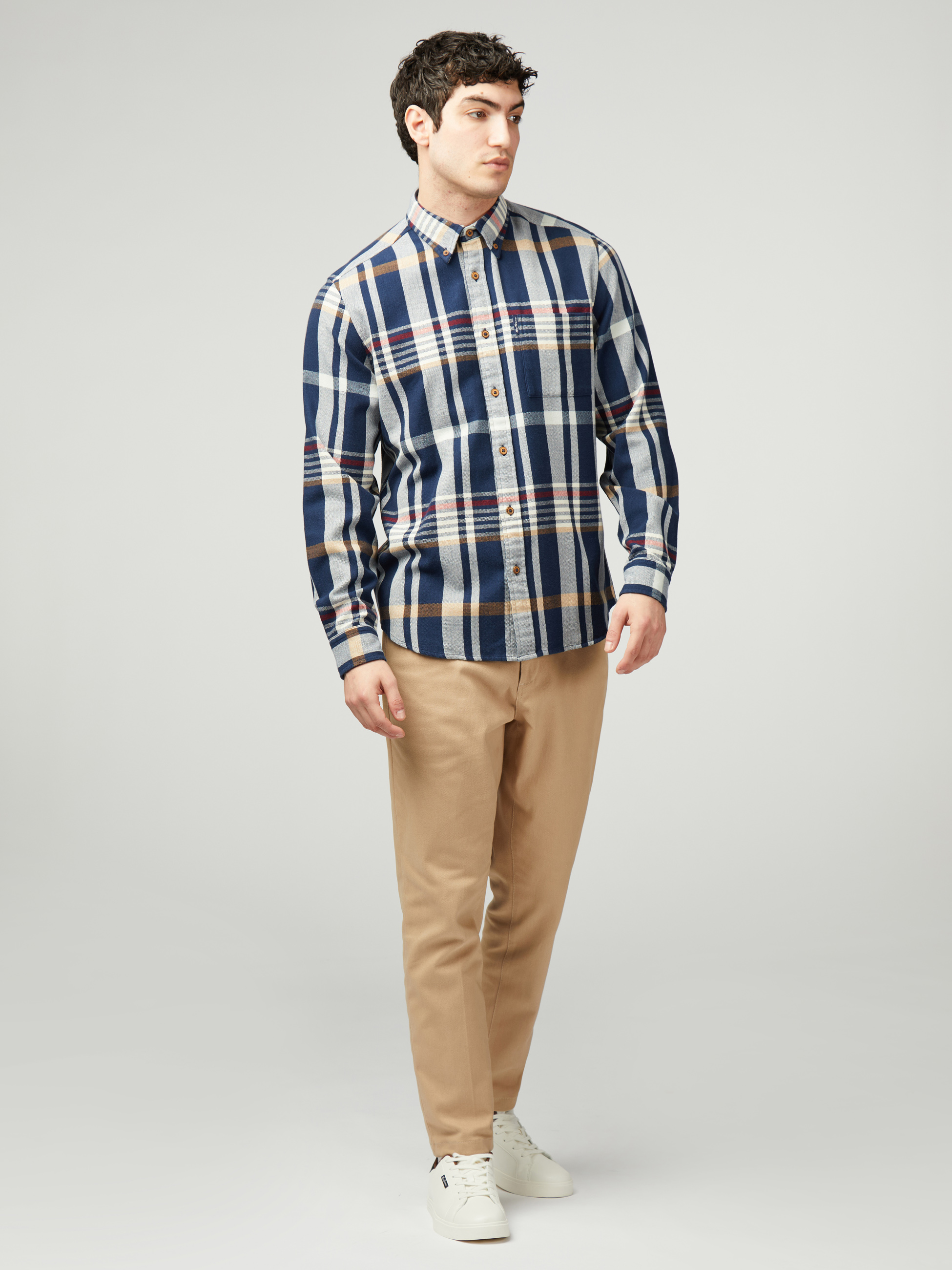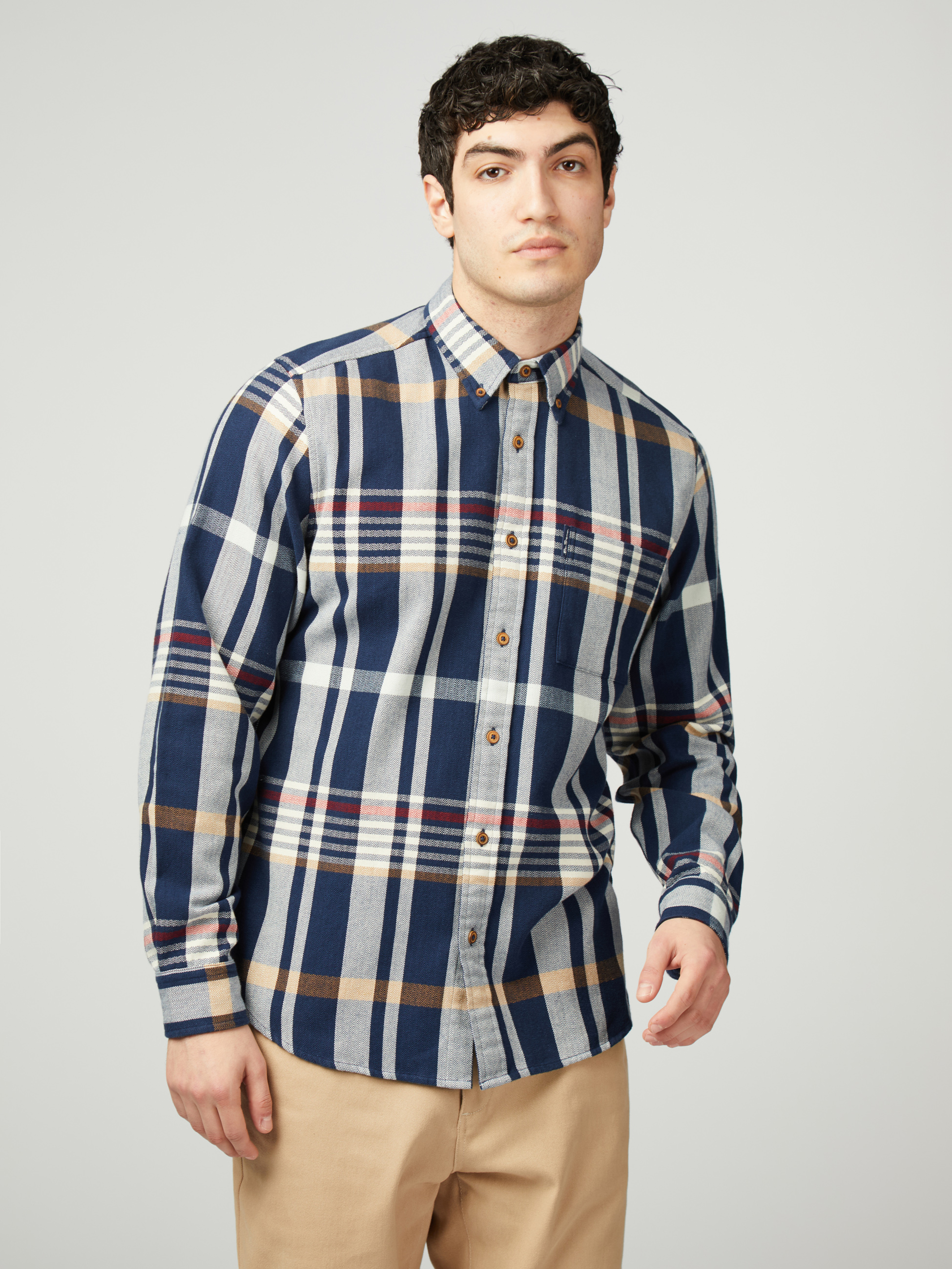 Confeccionada en 100 % algodón esta camisa a cuadros de manga larga con diseño de espiga incluye un cuello con botones de dos dedos y una etiqueta tejida con la marca “Ben Sherman” en el bolsillo del pecho. Un ajuste clásico con dobladillo curvado.