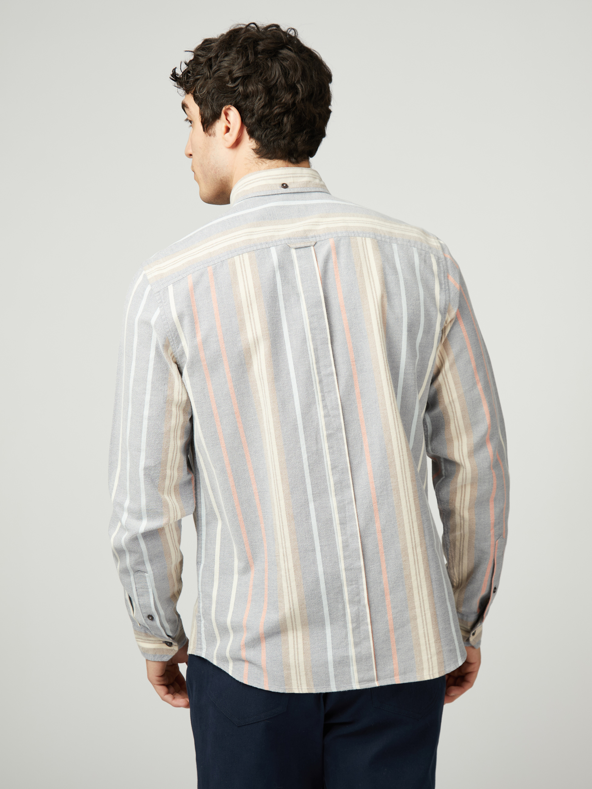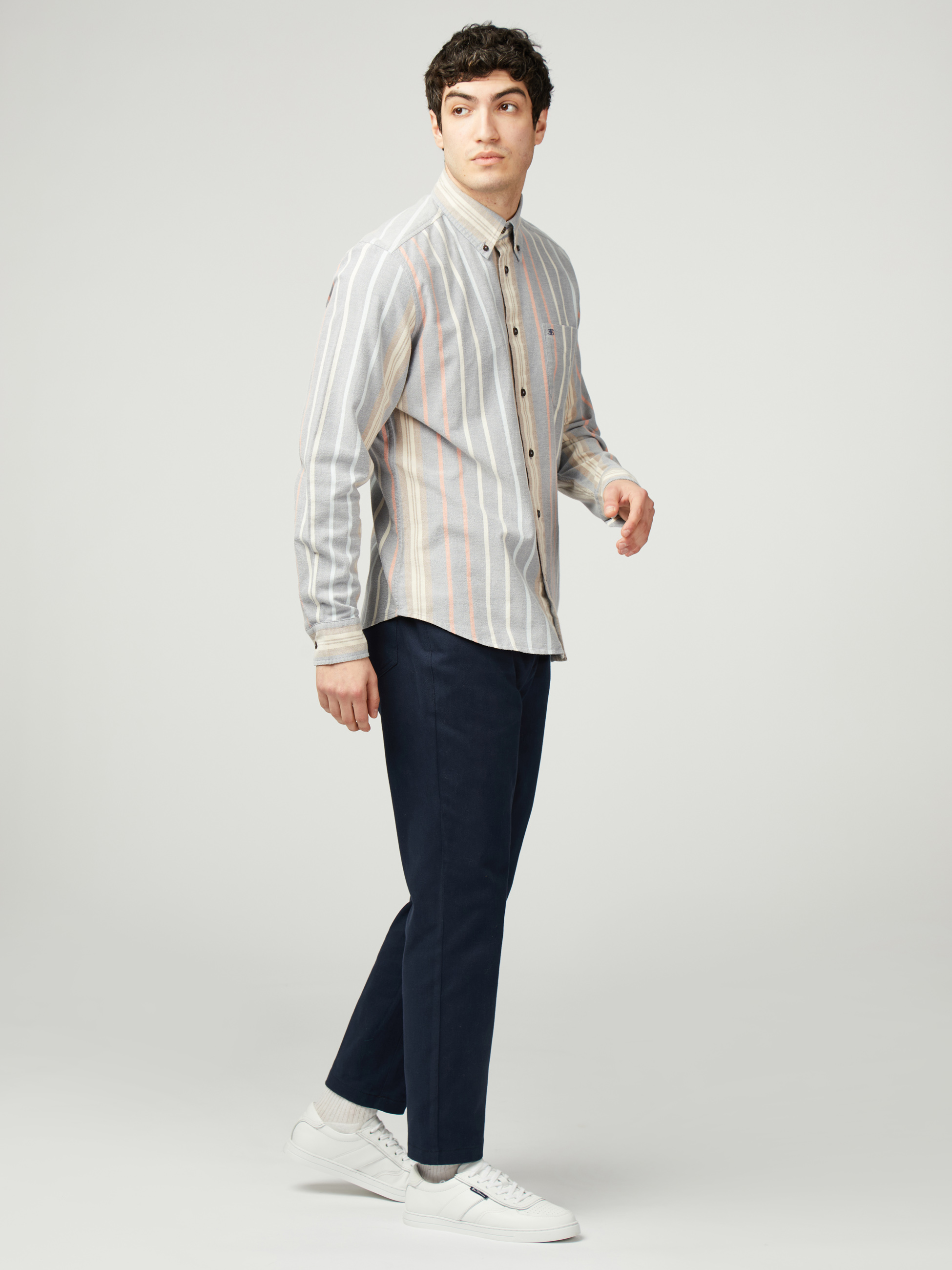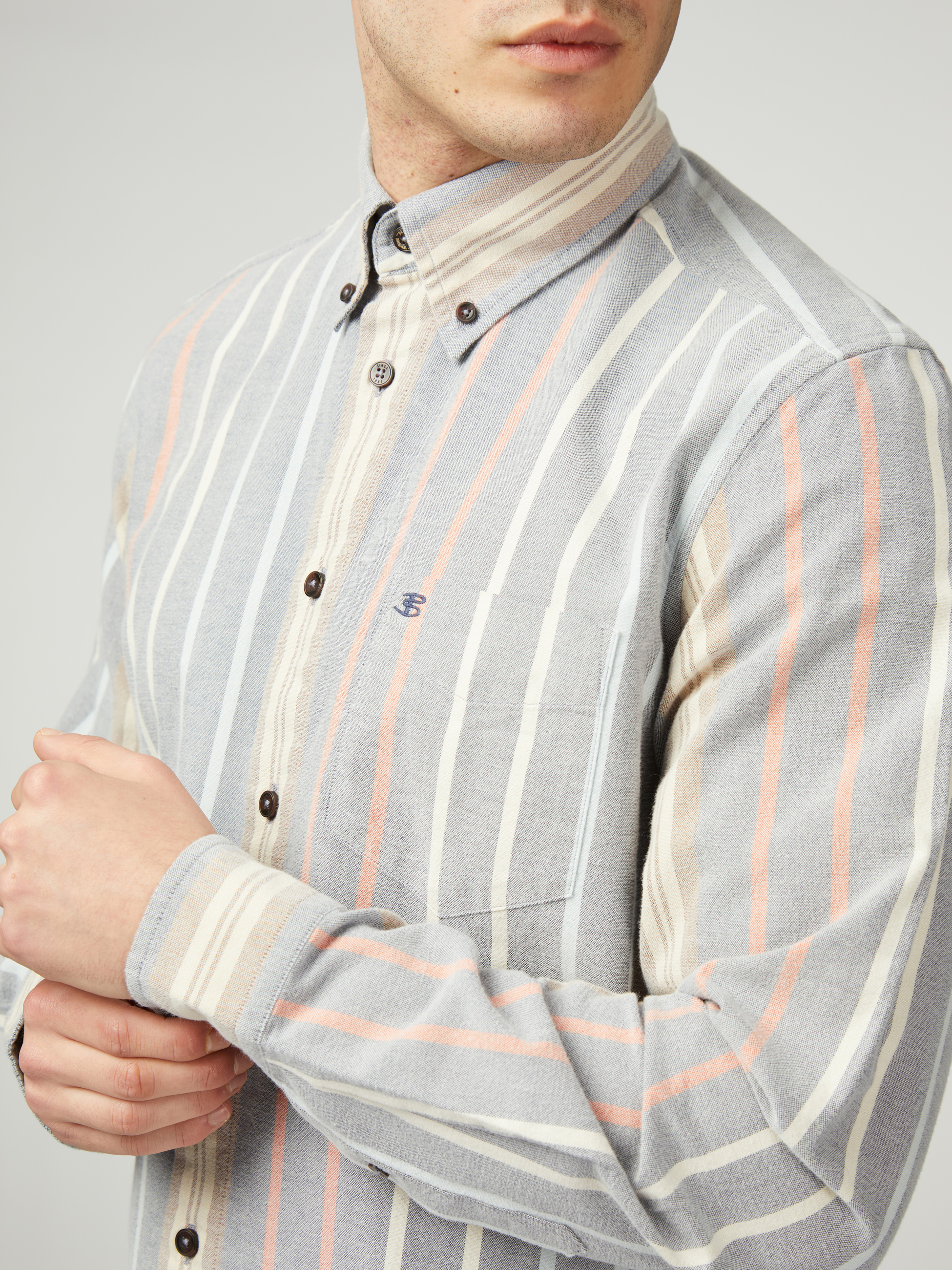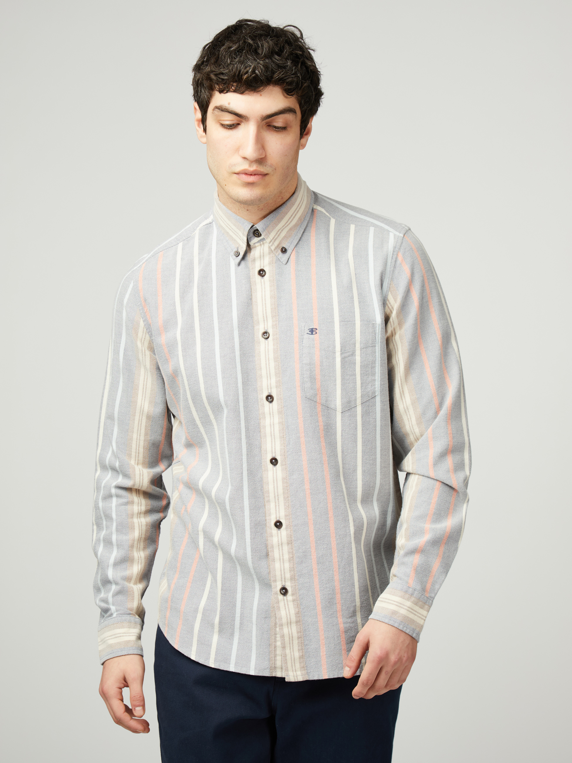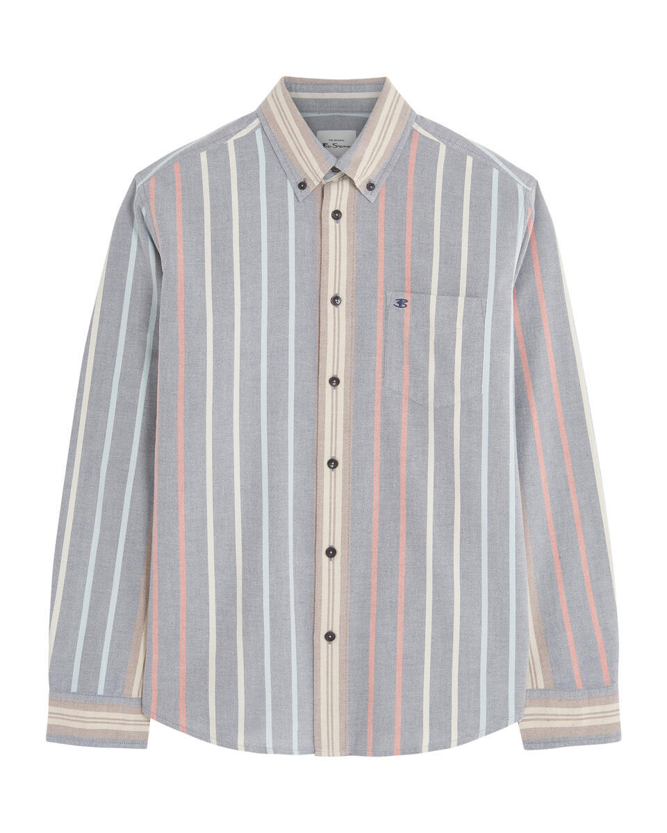 Confeccionada en 100 % algodón esta camisa de rayas variadas de manga larga incluye un cuello con botones de tres dedos y una “B” bordada en el bolsillo del pecho. Un ajuste clásico con dobladillo curvado.