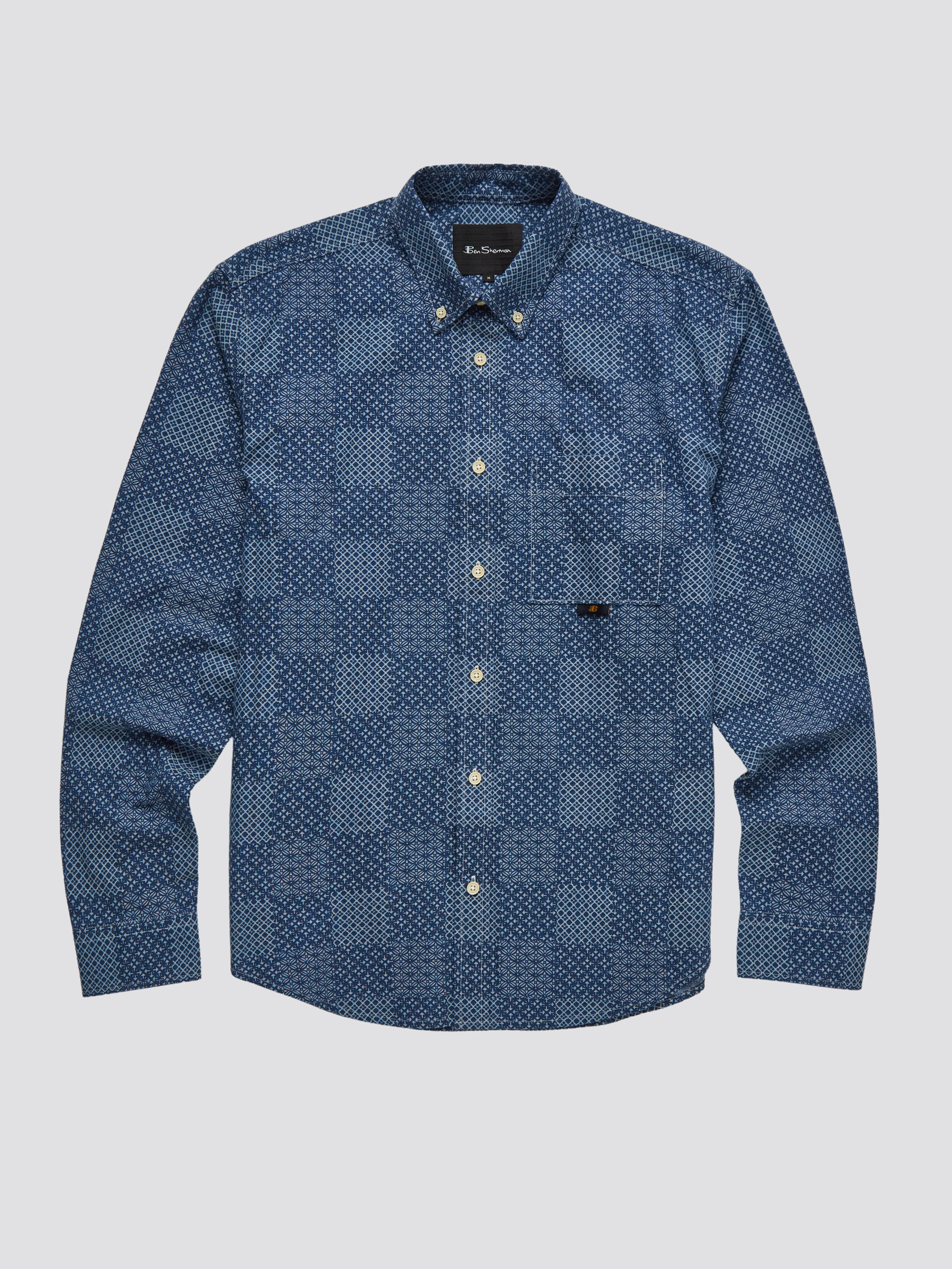 Esta camisa con estampado geométrico de patchwork de cambray viene en un ajuste relajado y cuenta con un bolsillo en el pecho y un cuello abotonado con 2 dedos.