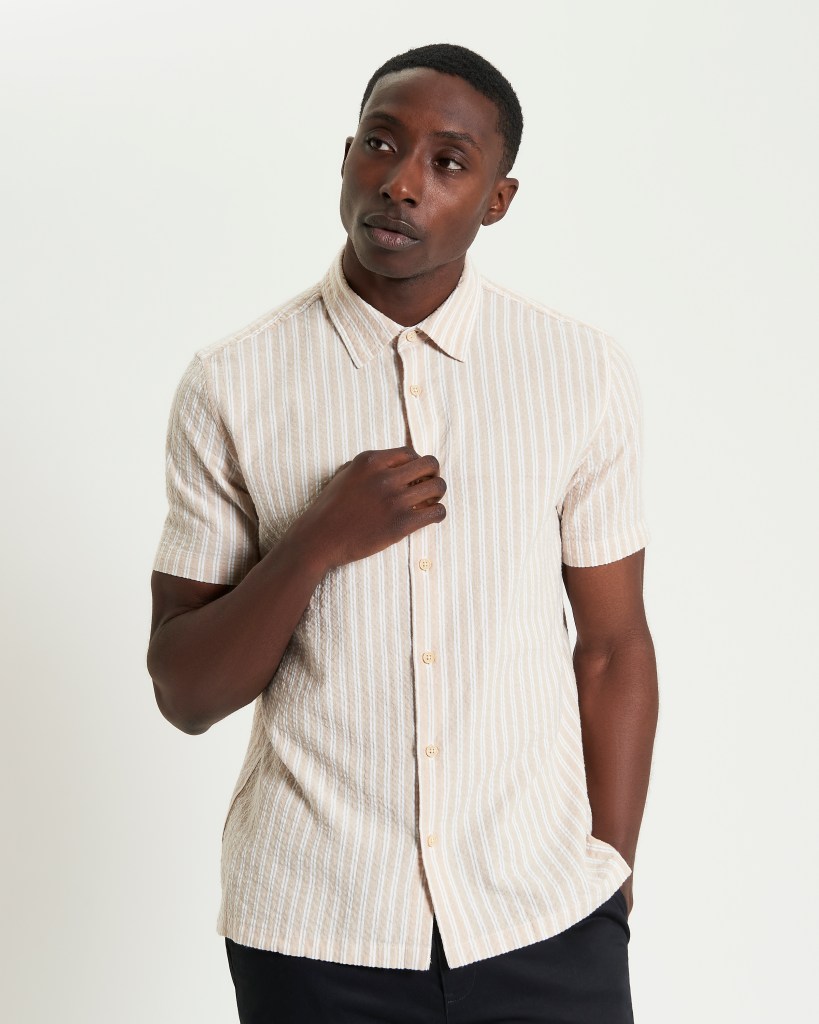 Camisa Ben Sherman casual con patrón de rayas sirsac en tela texturizada de100% algodón corte Carnaby fit de manga corta cuello tipo americano