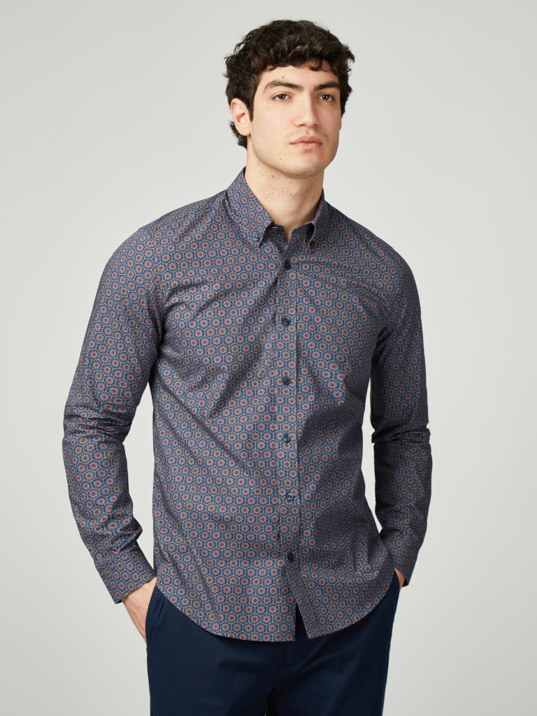 Una camisa de corte slim diseñada con un estampado de fular. Con dobladillo curvado cuello con botones de dos dedos y una etiqueta tejida con la marca “Ben Sherman” en la costura lateral. Hecho 100% en algodón orgánico.