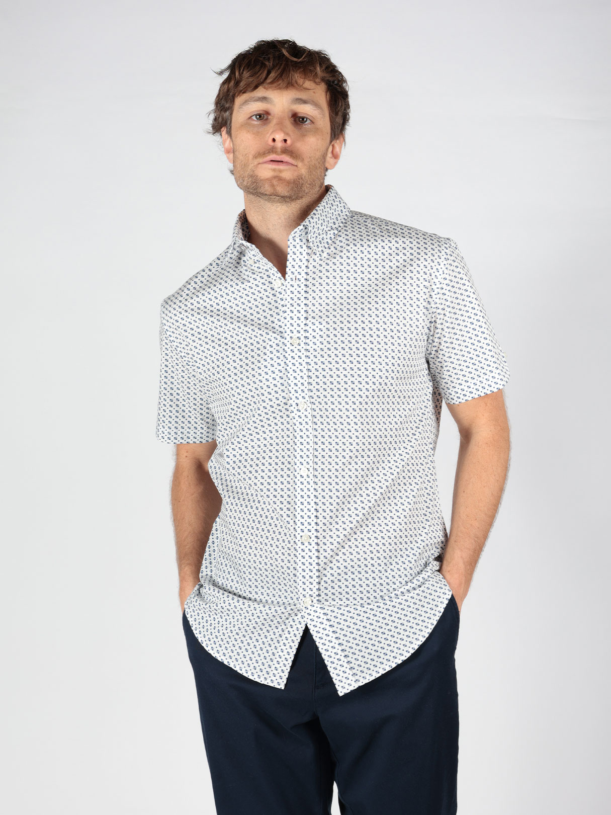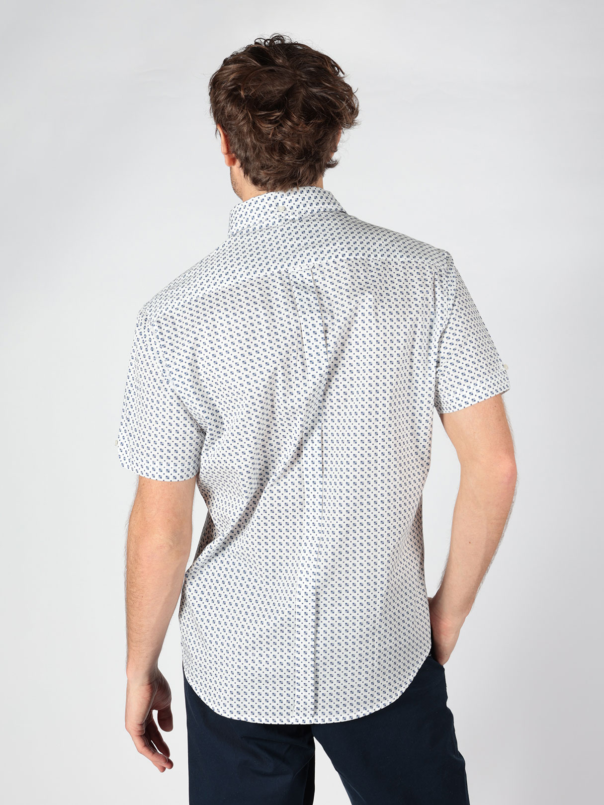 Esta camisa de ajuste regular presenta un estampado monobloque elegante y moderno. Cuenta con un dobladillo curvado un clásico cuello con botones ocultos tipo point y una etiqueta tejida con el logo Ben Sherman en la costura lateral.