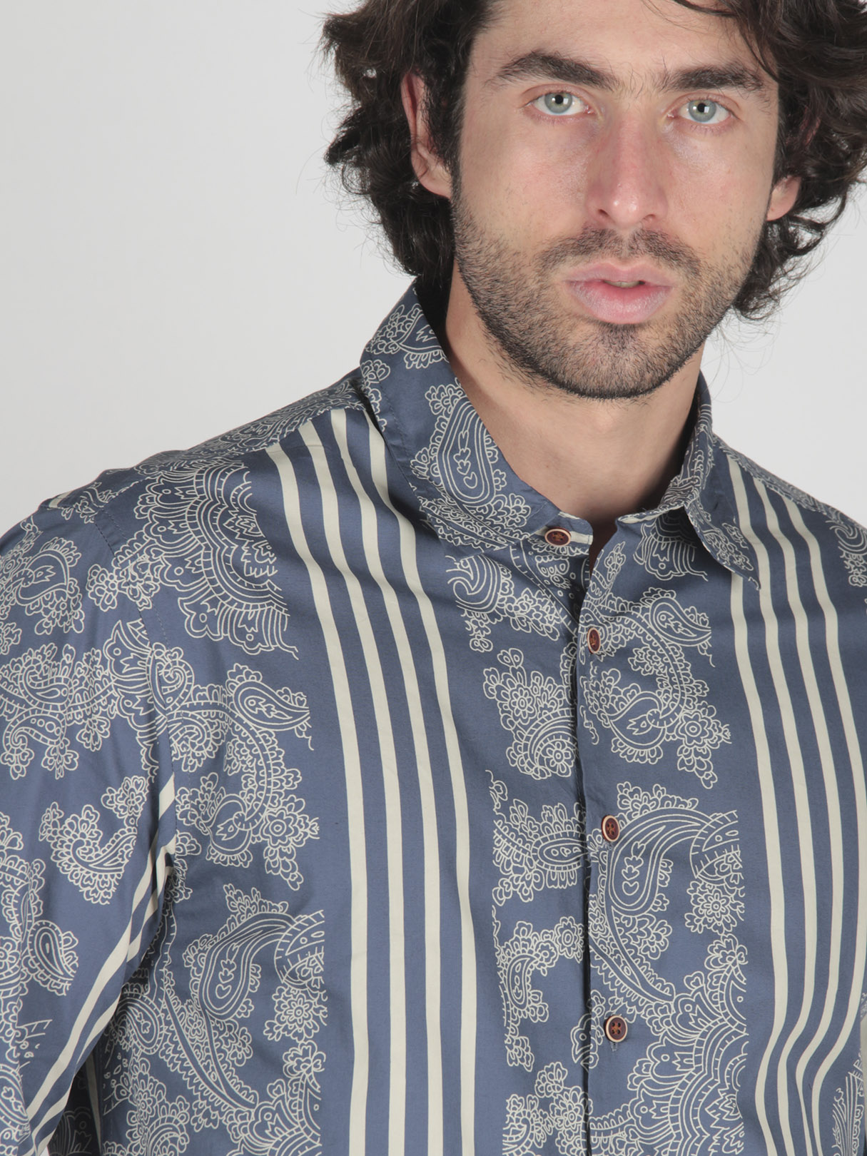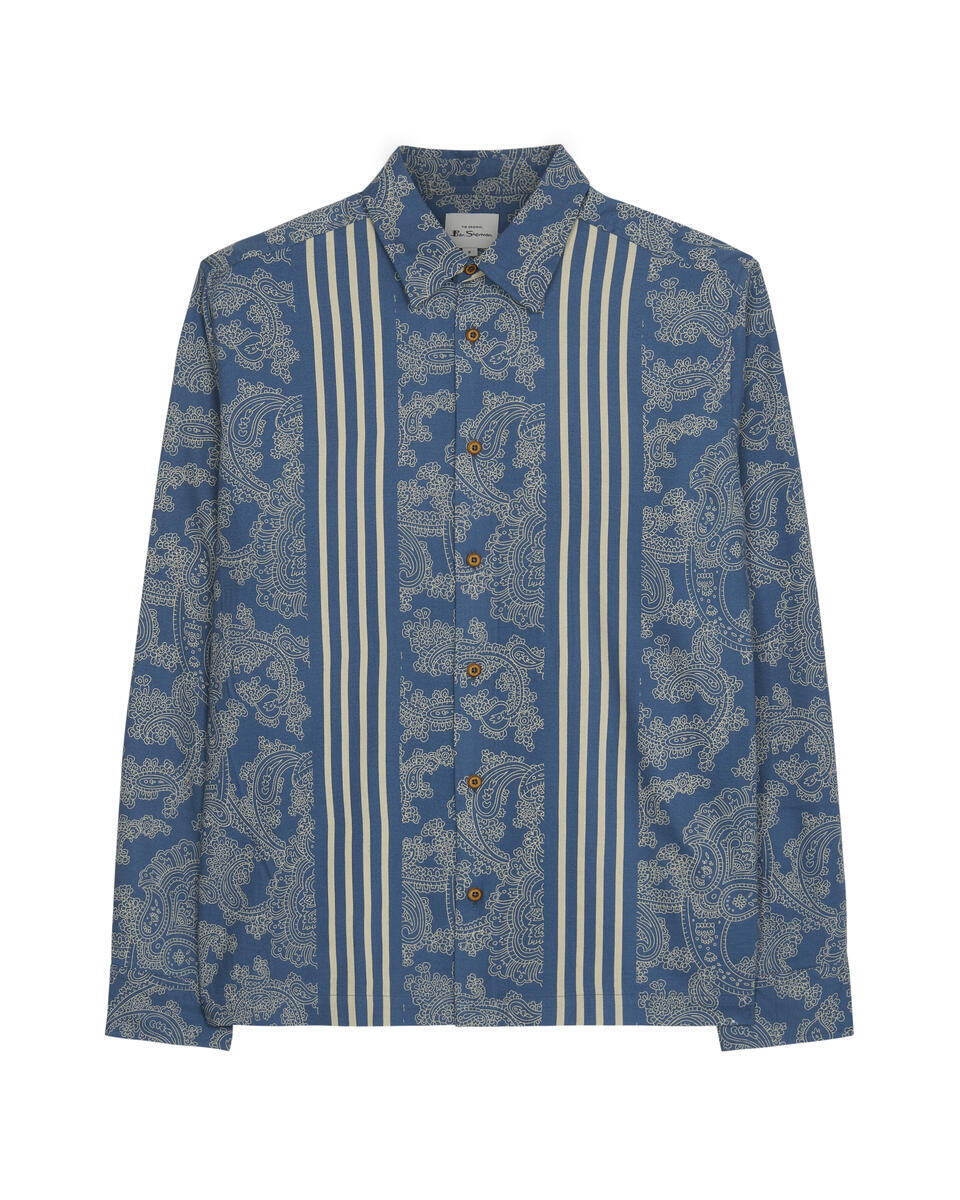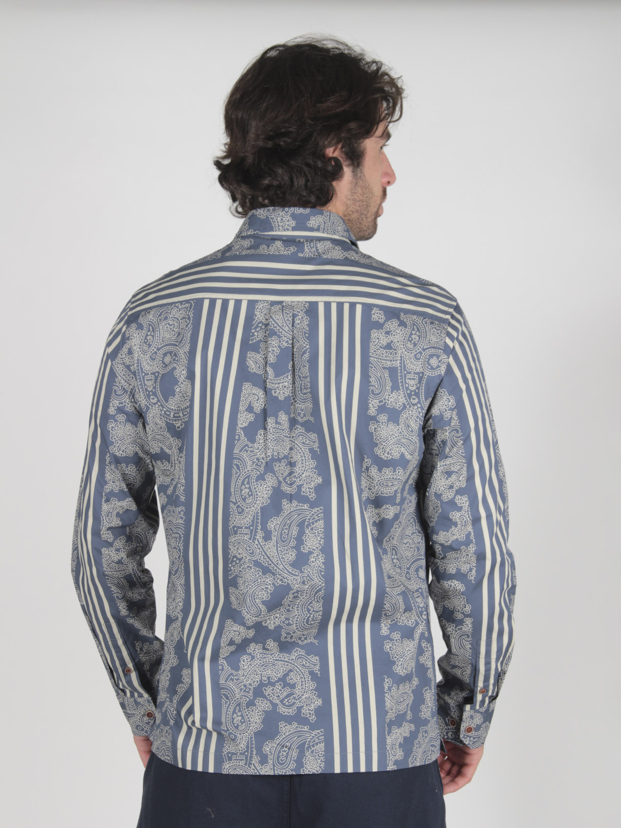 Una camisa de manga larga con ajuste regular que presenta un estampado integral. Con cuello de dos dedos botones de corozo pliegue y ganchillo en la parte trasera. Confeccionado en algodón.