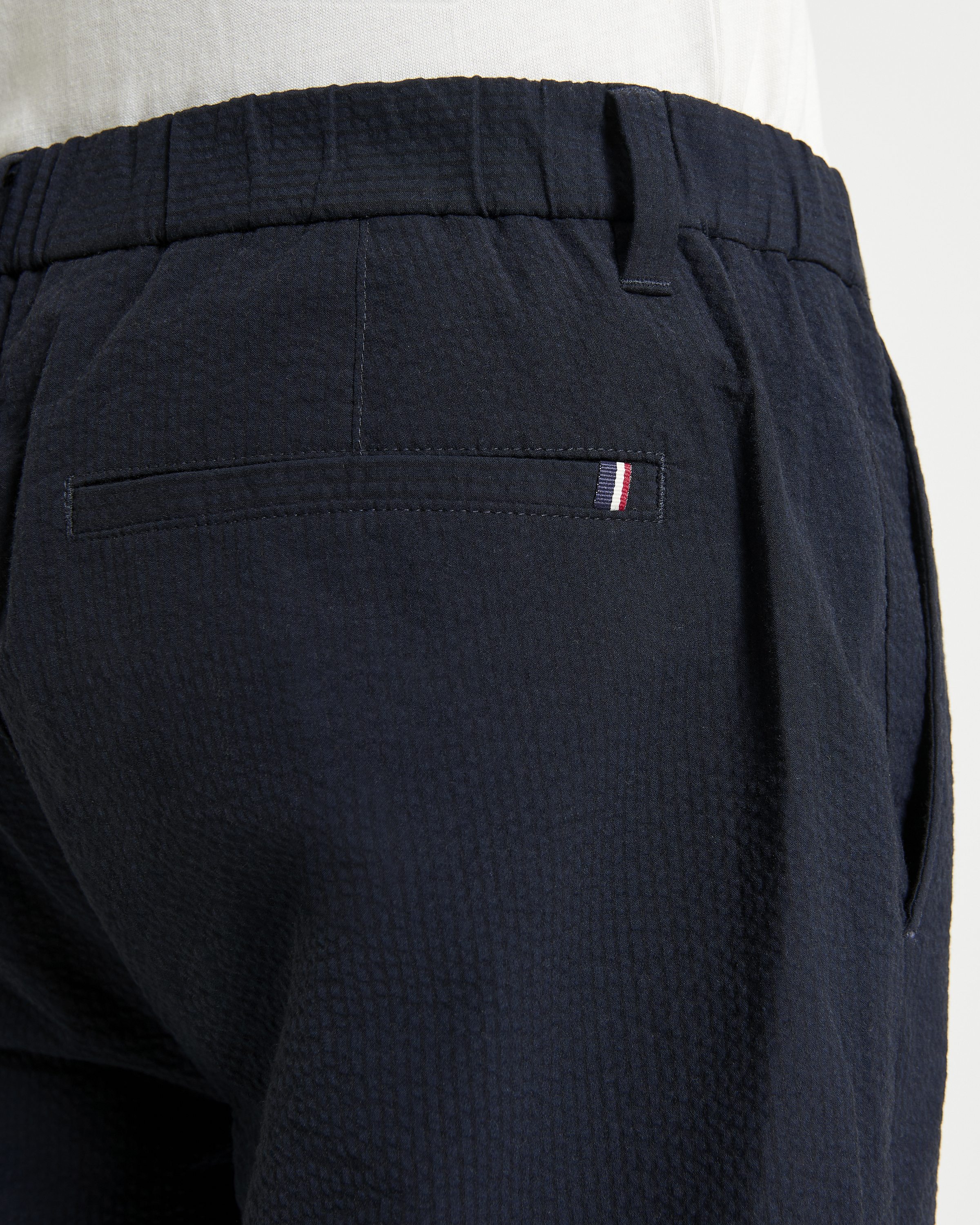 Un pantalón slim taper fit en tejido seersucker. Las características incluyen cuatro bolsillos externos y una cintura elástica. Con un guiño a nuestro legado este modelo presenta la cinta mod en la cintura y el bolsillo trasero.