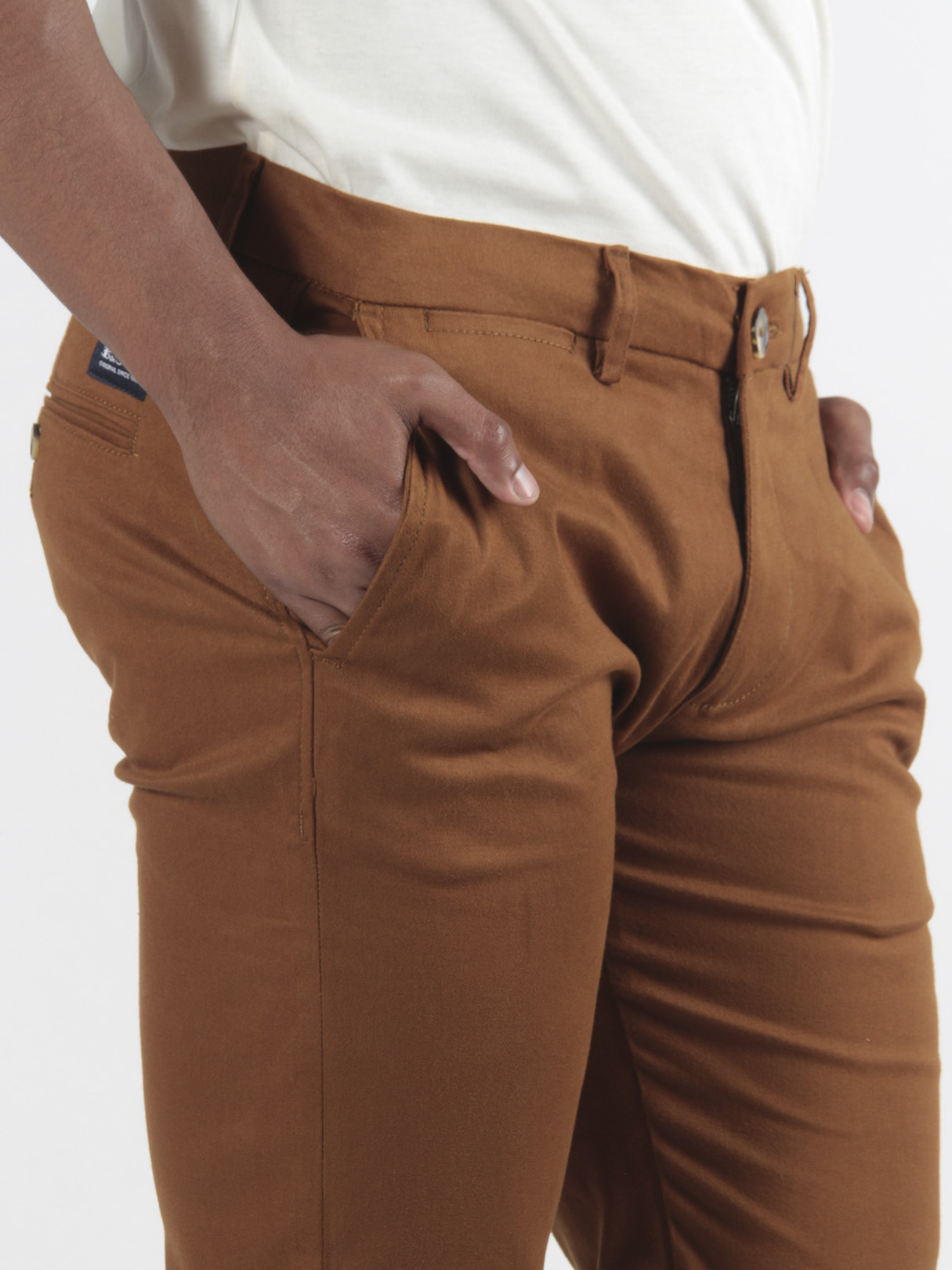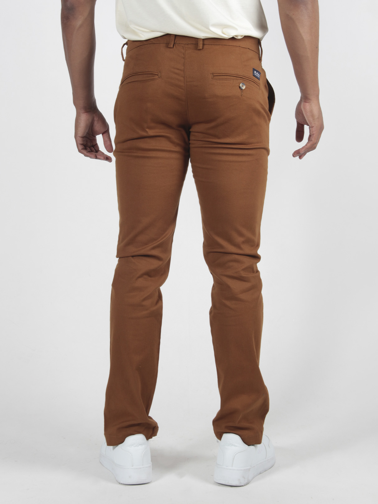 Un pantalón clásico chino en corte slim confeccionado en algodón. Cuenta con dos bolsillos laterales un bolsillo para monedas y dos bolsillos laterales detalles de rayas modernas en el dobladillo y la marca Ben Sherman en el centro de la espalda.