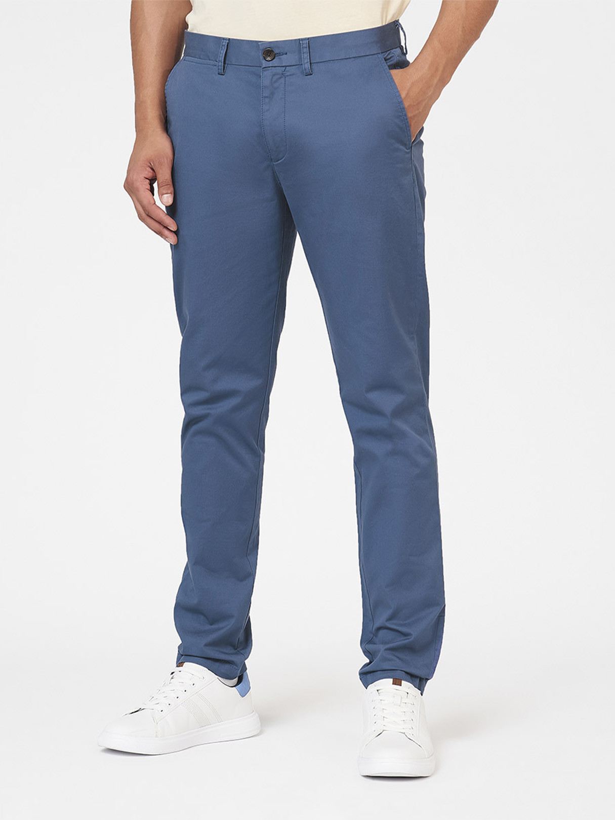 Un pantalón clásico chino en corte slim confeccionado en algodón. Cuenta con dos bolsillos laterales un bolsillo para monedas y dos bolsillos laterales detalles de rayas modernas en el dobladillo y la marca Ben Sherman en el centro de la espalda.