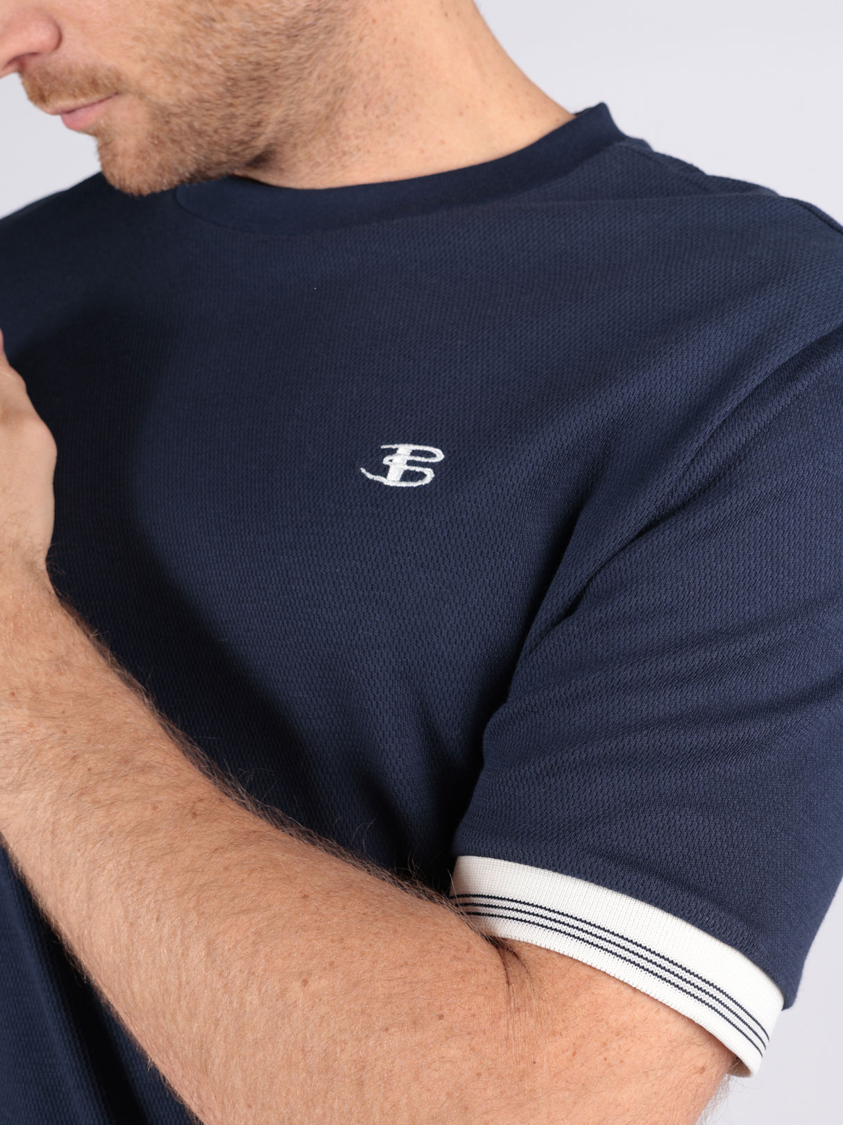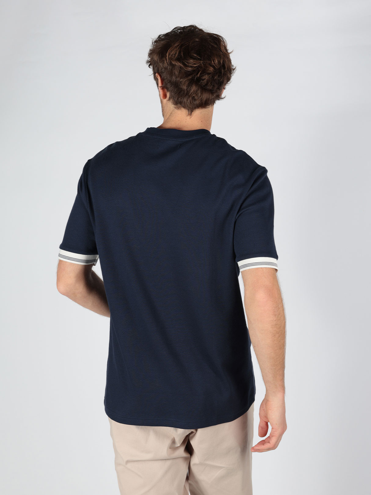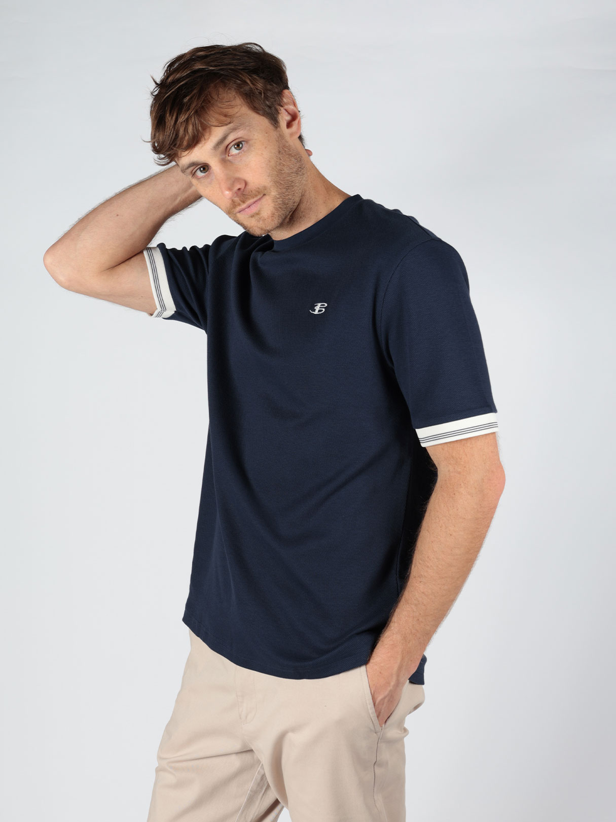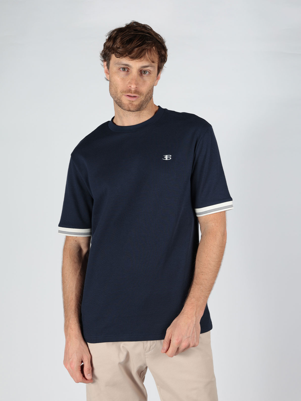 Playera de manga corta con cuello redondo confeccionada 100% en algodón. Cuenta con detalles en contraste en las mangas y un bordado con la letra B en el pecho izquierdo.