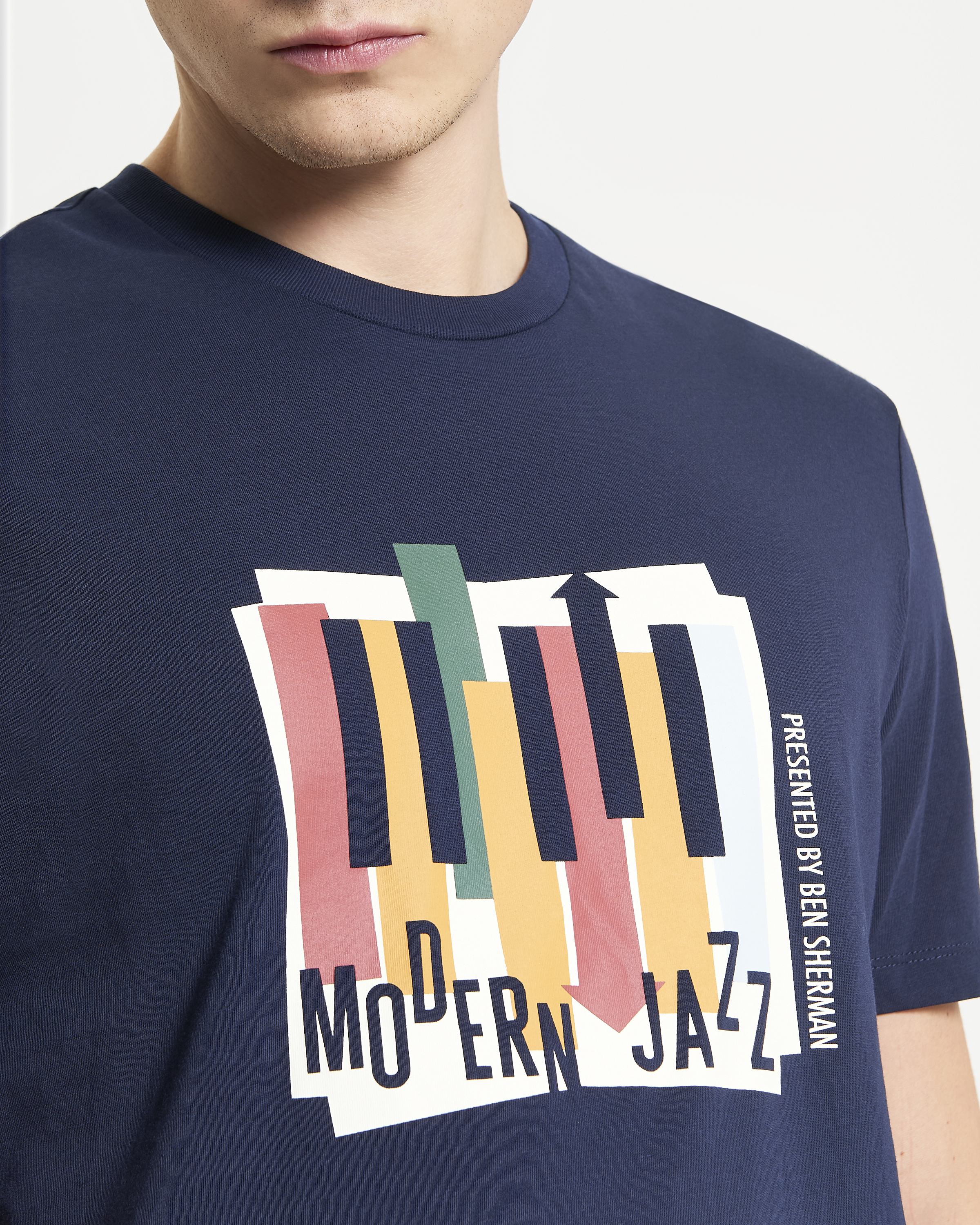 Playera de algodón orgánico 100% certificado GOTS de corte regular. Las características incluyen un estampado de pigmentos inspirado en la música.