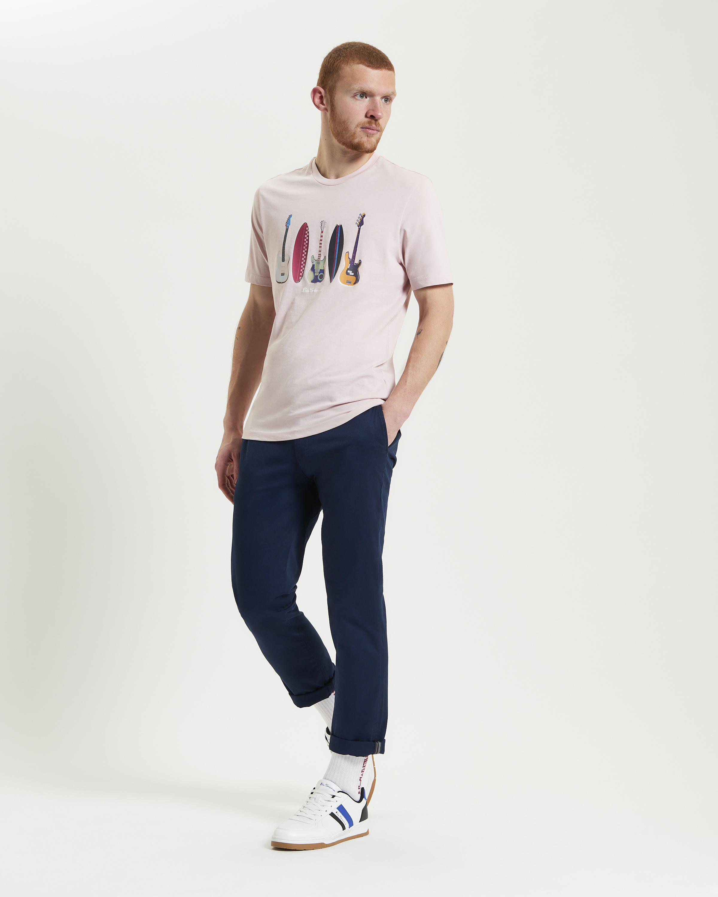 Playera de algodón orgánico 100% certificado GOTS de corte regular. Con un guiño a la escena musical esta camiseta presenta un estampado de guitarra abstracto.