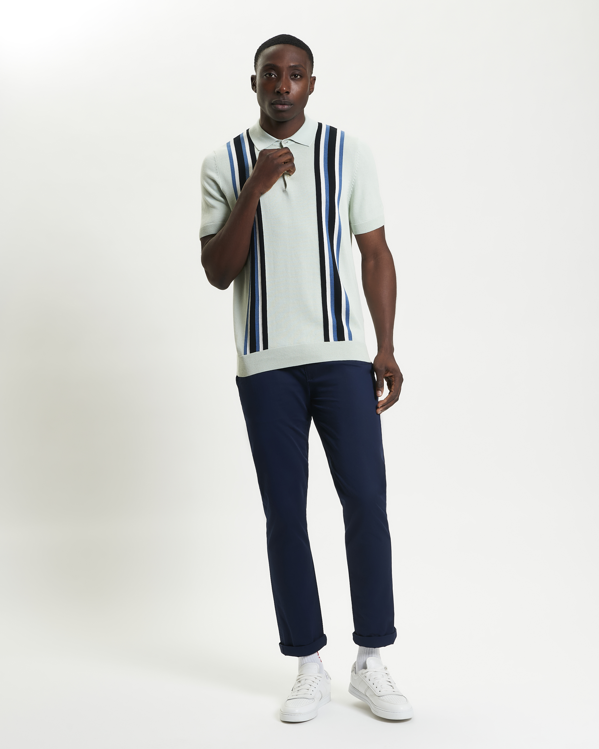 Polo Ben Sherman este polo de punto de rayas verticales de manga corta presenta una tapeta de 3 botones y un bordado “Ben Sherman” ™ en la manga izquierda. Un corte regular confeccionado en 100% algodón.