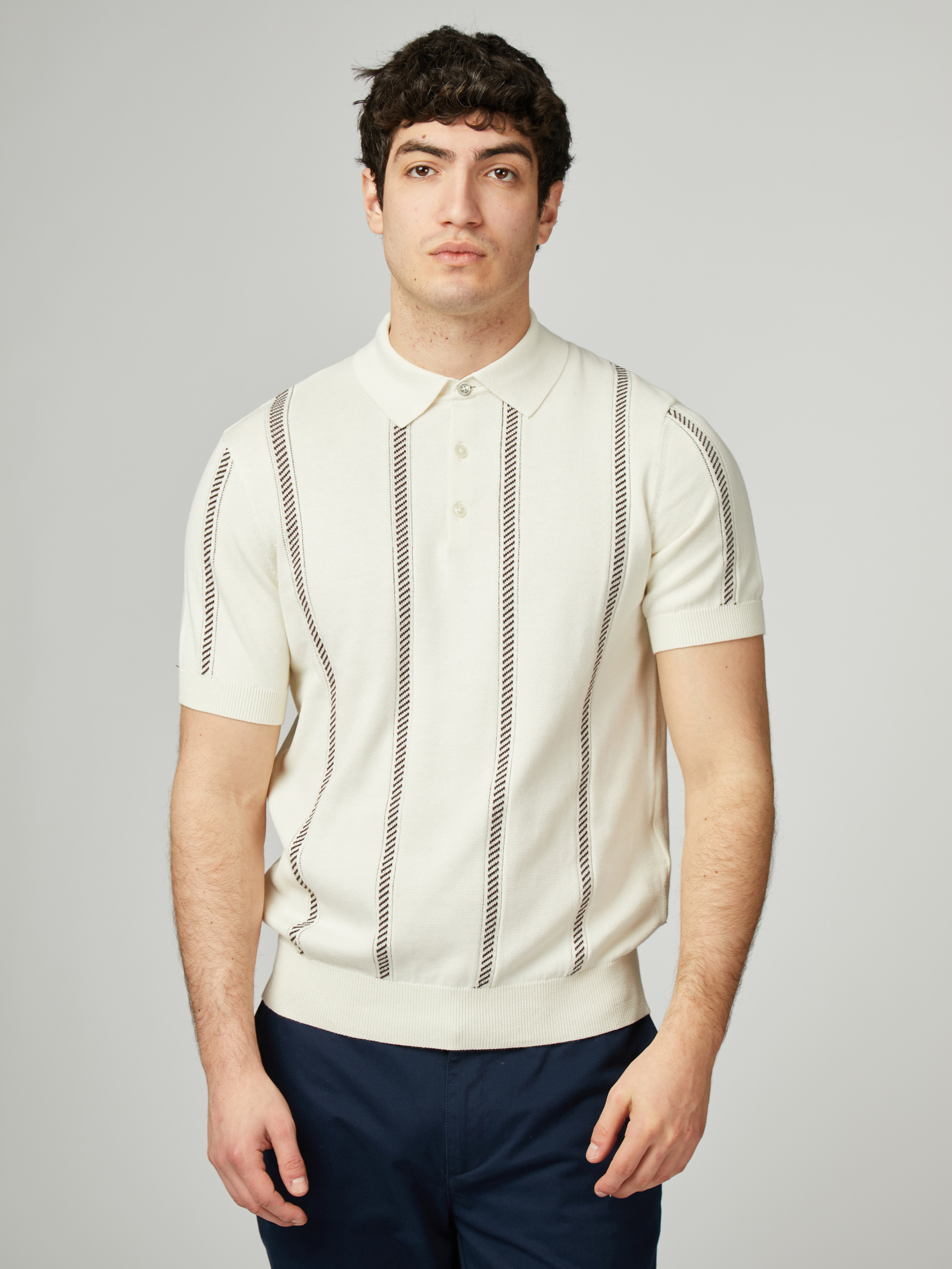 Este polo de punto en color Ivory de rayas jacquard Ben Sherman presenta una etiqueta tejida de la marca en la costura lateral con cierre de tres botones y un corte regular confeccionado con 100% algodón orgánico.