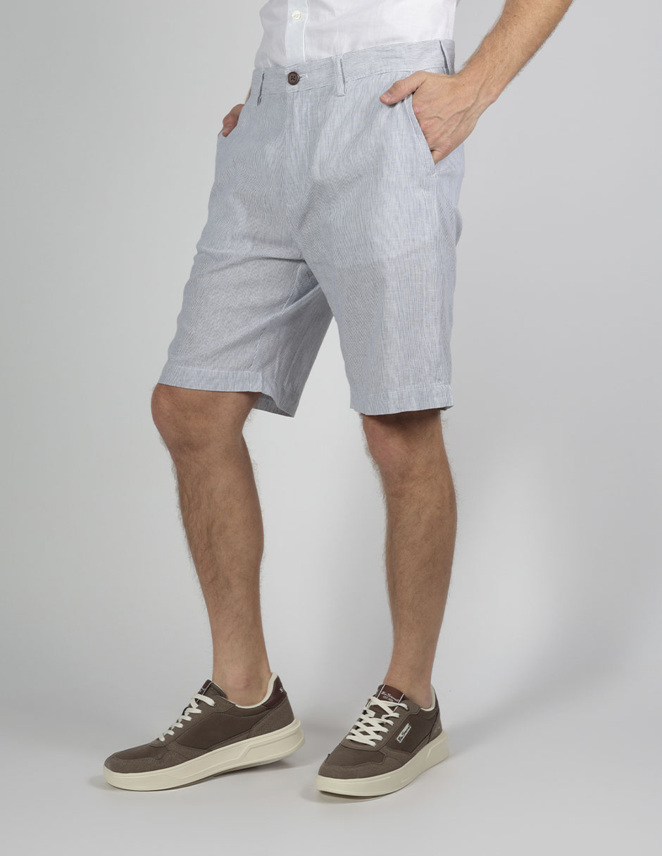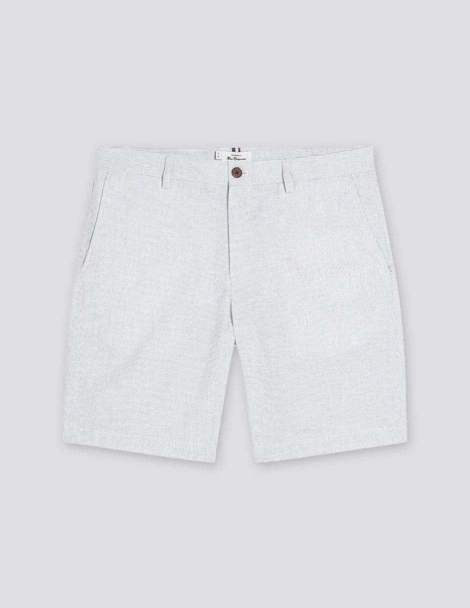 Pantalón corto de rayas confeccionado en una mezcla de algodón con lino que lo hace fresco y cómodo de cintura abotonada, trabillas y cierre de cremallera, dos bolsillos delanteros y dos bolsillos traseros con botón y etiqueta bordada de la marca Ben Sherman