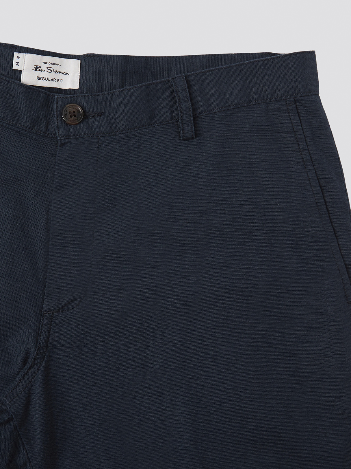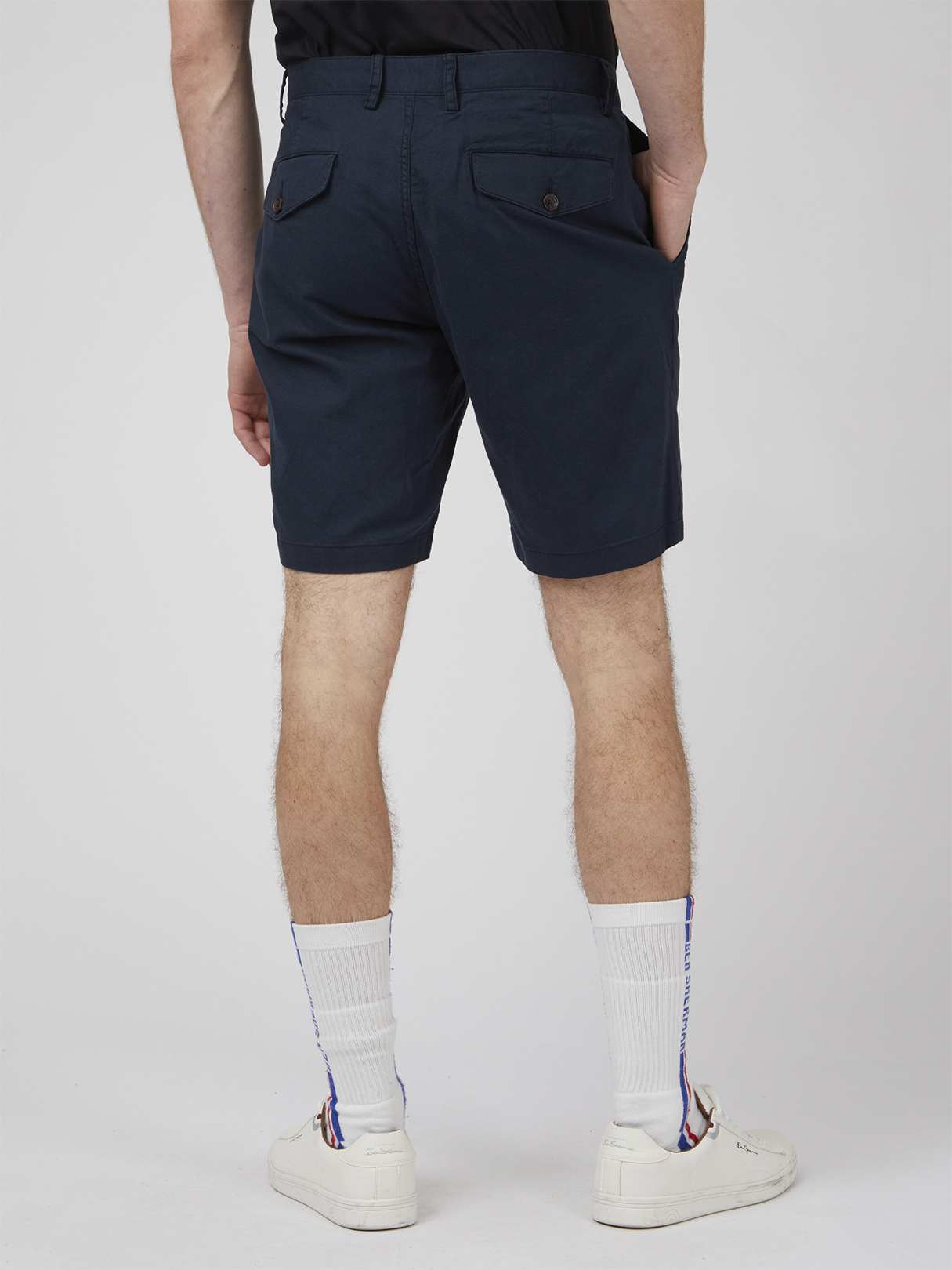Este pantalón corto de algodón y lino con un ajuste normal. Las características incluyen un ribete de la cintura en contraste insignia de Ben Sherman 2 bolsillos delanteros inclinados y botones en los bolsillos con solapa en la parte posterior.