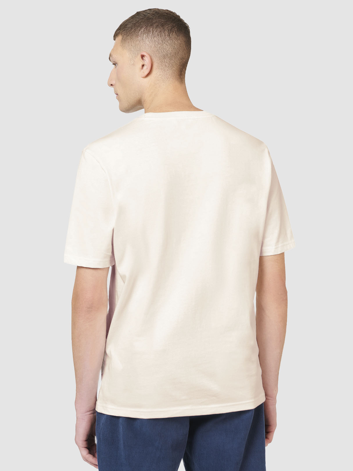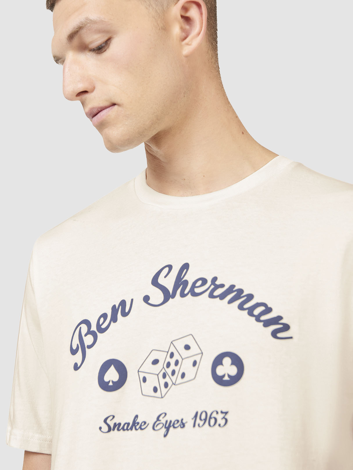 Camiseta 100% algodón orgánico certificado GOTS con un ajuste relajado. Las características incluyen un estampado de dados vintage bordado ‘Ben Sherman’ y un cuello en contraste.