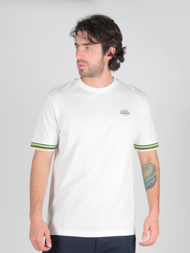 Una playera de corte relajado con cuello redondo confeccionada en 100 % algodón orgánico. Las características incluyen un estampado de pecho alto ‘Ben Sherman’ y un corte y puños cosidos en contraste.