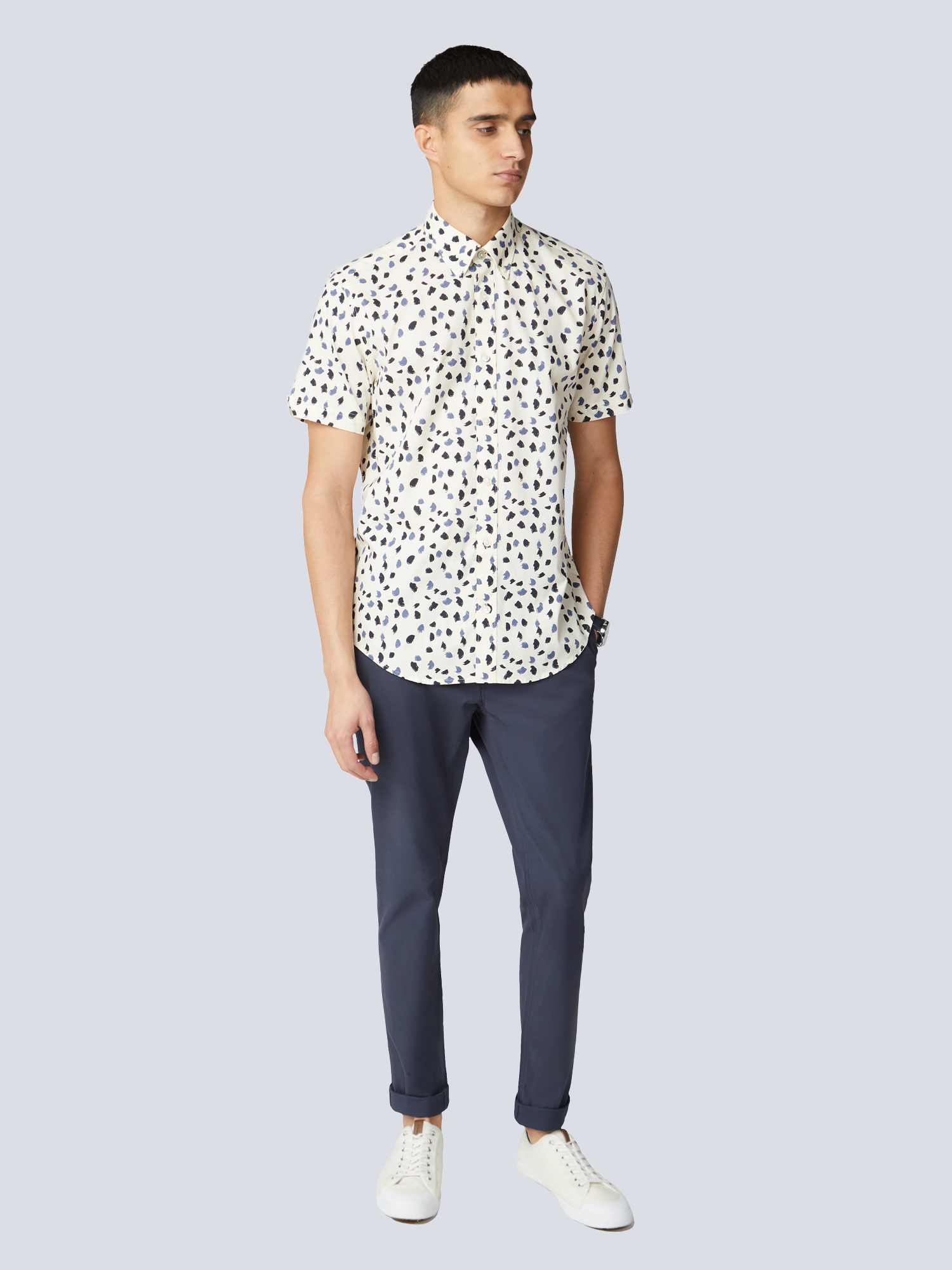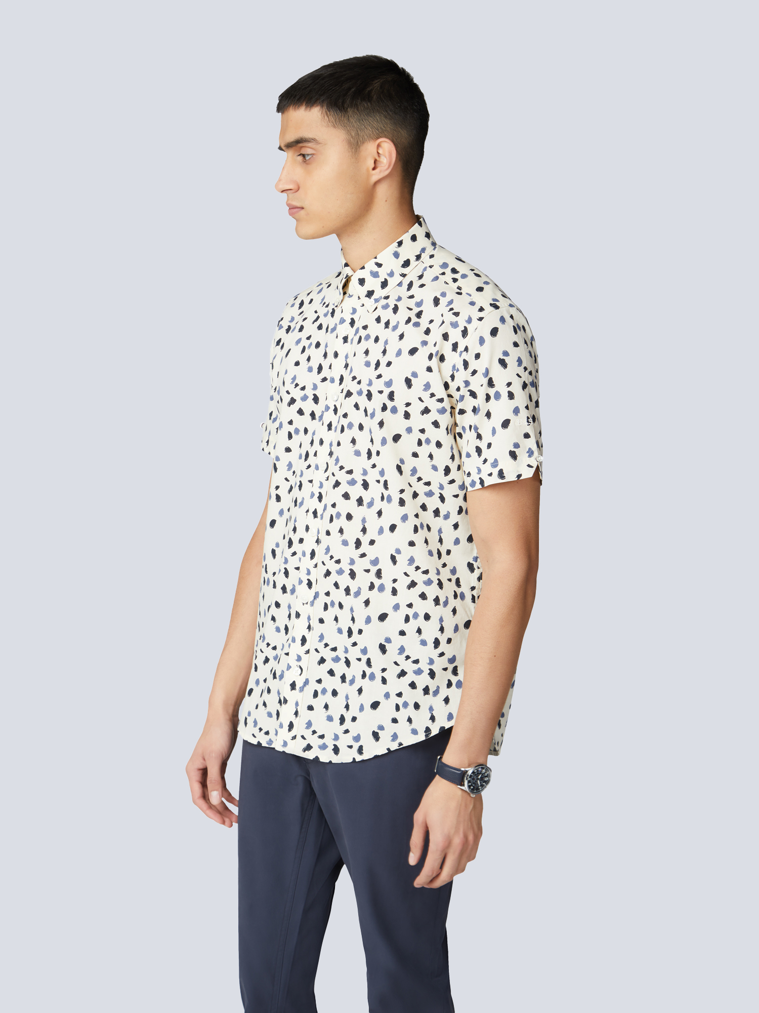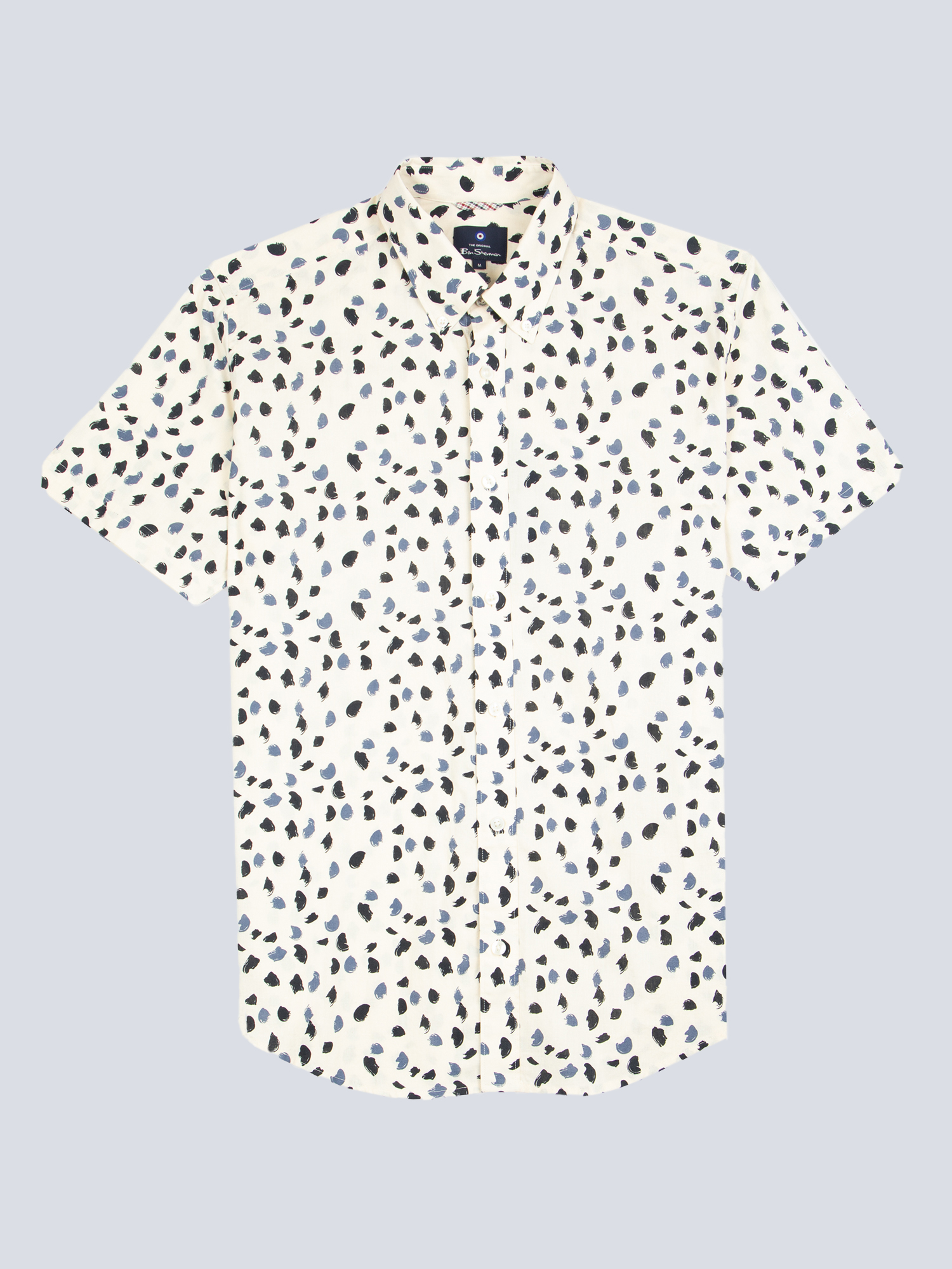 Camisa abotonada de manga corta con tela de algodón de primera calidad cuello abotonado de dos dedos y diseño de lunares de pintura.