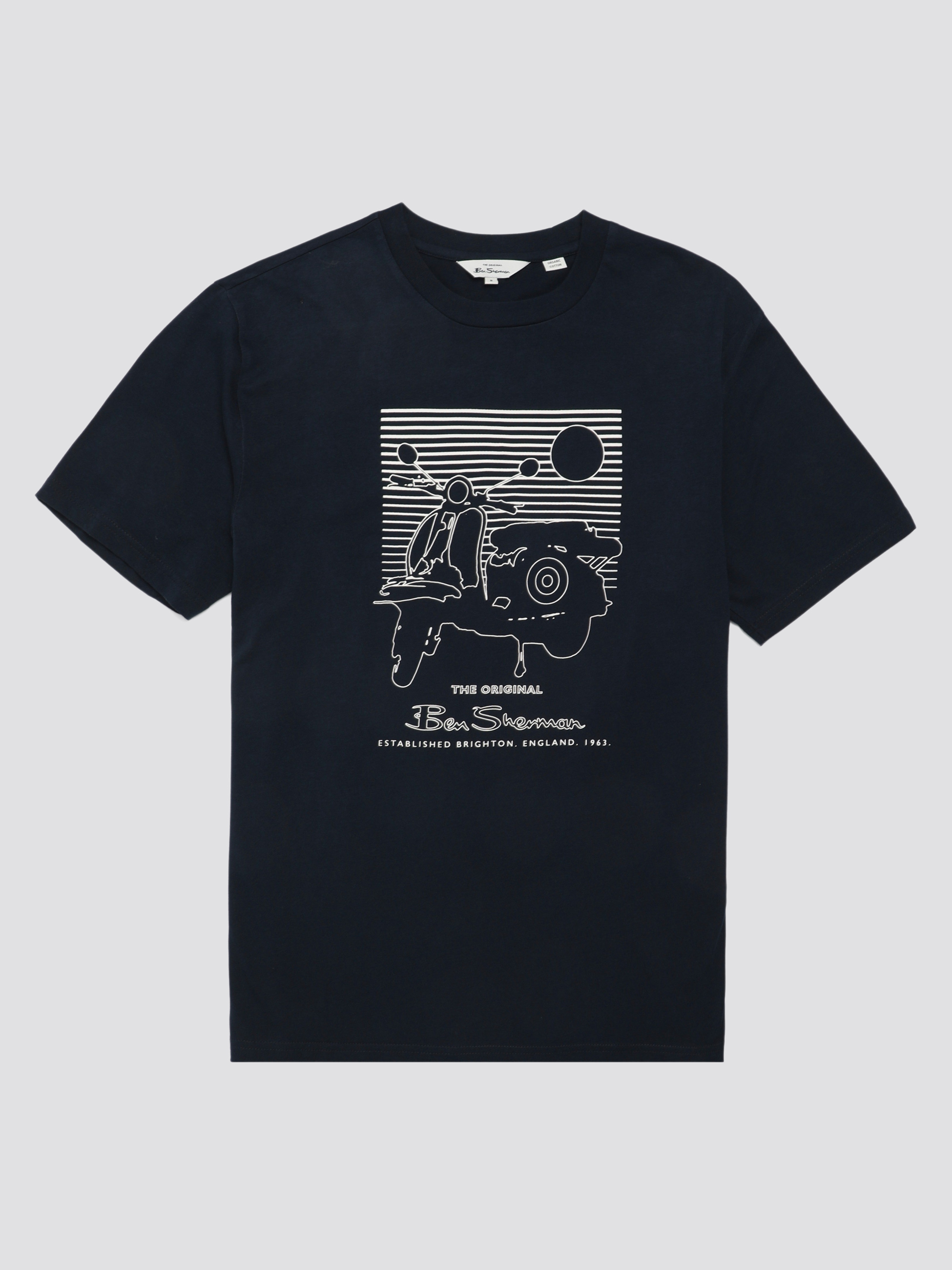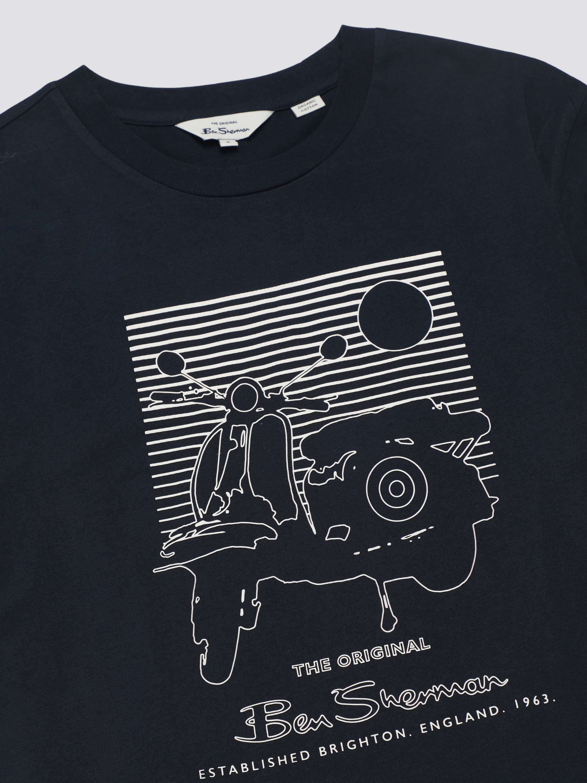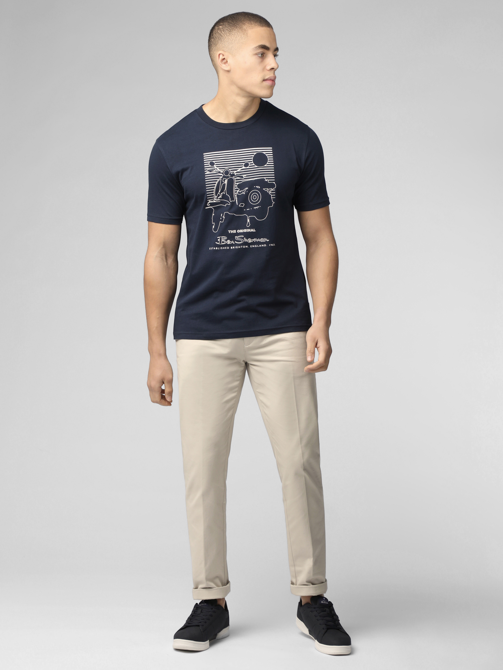 Playera Ben Sherman en algodón orgánico con certificación GOTS cuello redondo manga corta y ajuste regular. Con un guiño a nuestra herencia esta camiseta presenta un estampado de scooter alto en un diseño abstracto.
